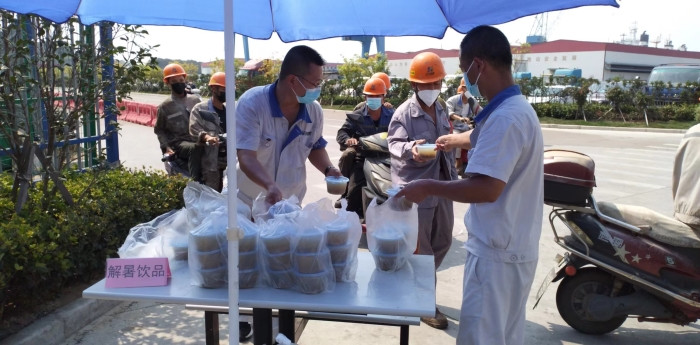 7月以來,持續(xù)的高溫天氣,考驗了船廠的修造工人,公司除了調(diào)整作息時間,避開高溫時段;生產(chǎn)現(xiàn)場增加高溫生產(chǎn)安全防護(hù)外,經(jīng)相關(guān)部門商議,決定不定期向工人們送防暑降溫冷飲,送發(fā)地點安排在員工寢室樓兩個通道出口處。